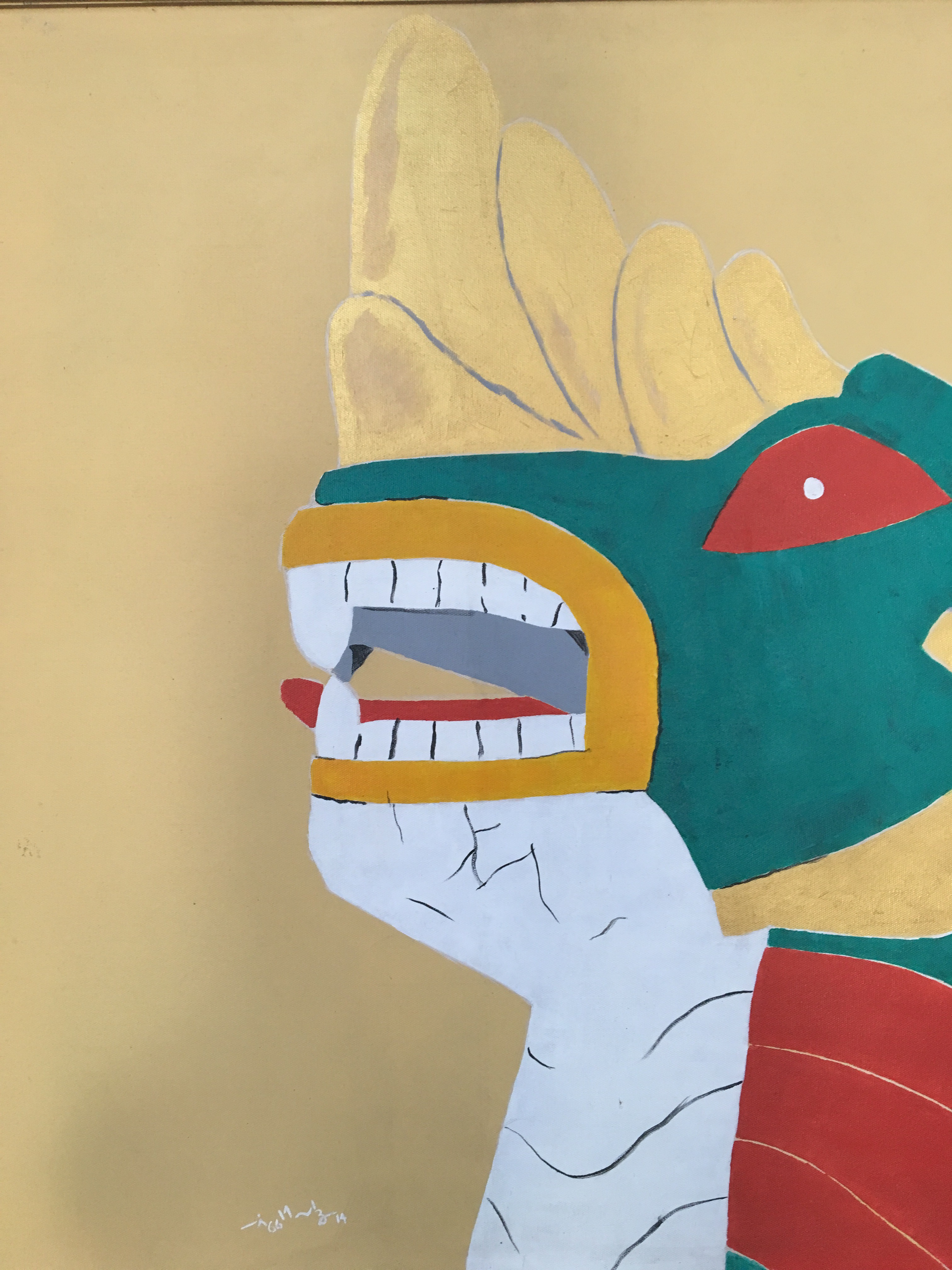Three years ago, Lwin Oo Maung sold 3 small paintings, 12 x 12 inches each. They were a Naga (dragon), a Phoenix (bird), and a Lion – Nat (spirit) guardians at the temples of Mrauk U in Western Myanmar. These animals were not the fearsome creatures one witnesses at the temples. They were almost comical – goofy smiles, animated faces, and all in the simplest of brushstrokes and most wonderful color combinations. His message was clear – why do we worship these silly creatures? They have no power other than that which we assign to them. There are more important issues to which we should be giving that power.